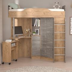 В комплект входит: кровать, внизу которой расположены вместительный угловой шкаф (полки и штанга), стеллаж для книг и компьютерный стол с дополнительным столиком.