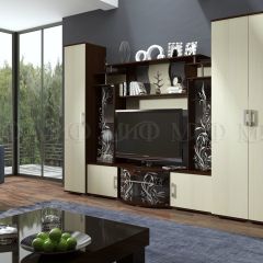 Актуальная модель с большой нишей под TV. Фасады шкафов окрашены в разные цвета. Стеклянные дверцы стеллажей декорированы растительным узором. Роскошный вариант для стильного интерьера.