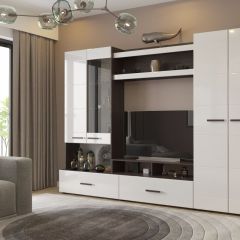 Cовременная модульная стенка с глянцевыми фасадами из МДФ и горизонтальной фрезеровкой имеет в своем составе вместительный распашной шкаф со штангой для плечиков, центральную секцию с нишей для ТВ и мультимедиа системы, а также шкаф-витрину с закрытой секцией и полками. В основании расположены два выдвижных ящика. Модульная стенка Ненси Люкс поможет правильно организовать ваше жилое пространство, вдохнуть новую жизнь в интерьер.Элементы, из которых состоит модульная система, могут комбинироваться друг с другом в разнообразных сочетаниях, при этом выглядя эффектно не только вместе, но и отдельно.