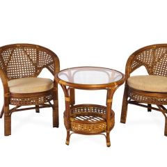 Комплект мебели Пеланги 02/15 включает в себя: 2 кресла и столик с красивым плетением снизу и полочкой, съемные подушки из материала улучшенного качества.