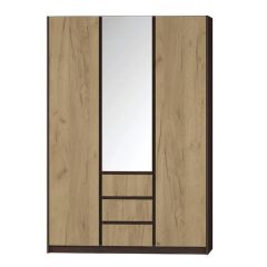 Шкаф для одежды и белья из коллекции "Флоренция" имеет 3 секции с распашными фасадами. Две боковые секции комплектуются полками и штангой для вешалок. В центральной части располагается секция с полками для одежды, 3 ящика для белья. Центральный фасад декорирован высоким зеркалом.
